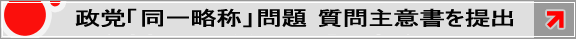 政党「同一略称」問題について会見を開きました! New 政党「同一名称」に関する質問主意書に対し、 4月27日に鳩山由紀夫内閣総理大臣名で答弁書が届きました。 これを受けて、午後3時から会見を開きました。 内閣総理大臣からの答弁書は、こちら (PDF) >>> 質問主意書の全文は、こちらから (PDF) >>> 今回の問題点を全て網羅した質問となっています。 ご一読ください。 総務省選挙部長からの回答は、こちら (PDF) >>> ★会見の映像はこちらから 会見録はこちらでご覧になれます ★関連記事はこちら 読売新聞 http://www.yomiuri.co.jp/politics/news/20100427-OYT1T01041.htm スポニチ http://www.sponichi.co.jp/society/flash/KFullFlash20100427104.html 共同通信 http://www.47news.jp/CN/201004/CN2010042701000741.html 時事ドットコム http://www.jiji.com/jc/c?g=pol_date1&k=2010042700384 神戸新聞 http://www.kobe-np.co.jp/news/shakai/0002920762.shtml 産経ニュース http://sankei.jp.msn.com/politics/situation/100427/stt1004272109024-n1.htm 政党「同一略称」に関する質問主意書を提出 新党日本代表の田中康夫は4月19日、政党「同一略称」に関する質問主意書を 横路孝弘衆議院議長を通じて、内閣に提出しました。 通常、約1週間で回答を得られる予定です。 質問主意書の全文は、こちらから (PDF) >>> 今回の問題点を全て網羅した質問となっています。 ご一読ください。 New 総務省選挙部はトンデモ話を許すのか 日刊ゲンダイ「にっぽん改国」 2010/04/22 New 「民主」「新党」「日本」しかなくなる!? (PDF) 日刊スポーツ「政界地獄耳」 2010/04/21 >>> 「日本」で質問主意書 略称めぐり田中康夫氏 ≪共同通信配信記事≫ 新党日本の田中康夫代表は19日、「新党日本」と「たちあがれ日本」の参院選での略称がともに「日本」になる可能性がある問題で、有権者を混乱させな いため、総務省に回避策をただす質問主意書を衆院議長に提出した。 主意書は、政党の正式名称は同一を認めないのに略称は同じでかまわないとする根拠を示すよう求めるとともに 、原口一博総務相に対し「迅速で的確な対処 こそ政治主導の真骨頂だ」と対応を促している。 総務省はこれまでに、公選法上の規定がないことを理由に、同じ略称を避け る手だてはないとの見解を示している。 2010/4/19 20:16 ★同一名称の政党は存在を認められないが、政党の同一略称に関しては、 法律上、特段の規定が無いので認められるとする総務省の「見解」に対して、 4月14日(水)15:30から、新党日本ヘッドオフィスで田中康夫代表が会見 を開きました。 共同通信 http://www.47news.jp/CN/201004/CN2010041801000366.html 総務省、回避策示せず 略称「日本」問題 「新党日本」と「たちあがれ日本」の参院選での略称がともに「日本」にな る可能性がある問題で、所管の総務省は「届け出期間(4月26日〜5月2日) 内に出された略称と同じ名前を、後から別の党が付けることはできないが、期間 内に同じ略称が出された場合の規定はない」として、同一略称を回避する手だて はないとの見解だ。 これに対し、過去3回の国政選挙で「日本」を使ってきた新党日本の田中康 夫代表は「混乱が起きないようにするのが選挙をつかさどる部署の役目。国民が 納得するボールを打ち返すのが責務だ」と批判。有識者からも「有権者が混乱す る可能性があり、対応策をとらないのは責任放棄だ」との指摘が出ている。 原口一博総務相は16日の記者会見で「わたしたちの判断でAとかBとか言 えるかどうか検討してみたい」としており、対応が注目される。 両党の略称がともに「日本」になれば、「日本」と書かれた票は両党の有効 投票の割合で割り振る「案分」になり、投票者の意思と異なる結果になる可能性 がある。 新聞などメディアが政党の公約を報じる際に略称を使うことがあり、読者が 両党の政策を取り違える恐れも。ほかにポスターや選挙公報など、混同が予想さ れるケースは多い。 総務省は地方選で同姓同名の候補者がいる場合、公選法に規定はないが、区 別のため住所や職業を候補者名に付記することを認めてきた。関係者からは「工 夫すれば解決策が出るのではないか」との声もある。 政党の正式名称については政治資金規正法が同一を禁じており、同じ名前の 政党が誕生することはない。 2010/4/18 17:41 共同通信 http://www.47news.jp/CN/201004/CN2010041601000272.html 総務相「止める手だてない」 新党の同一略称で ★会見の映像はこちらから 会見録はこちらでご覧になれます また、総務省自治行政局選挙部長宛の質問状はこちらで御覧になれます。(PDF) ★総務省は、上記の計7項からなる質問に対する文書による回答を、 4月14日正午までに選挙部長名で行うとしておりましたが、 丸2日を過ぎた4月16日午後2時段階でも頂戴出来ていないため、 再度、回答依頼の書面を送付しました。 その内容はこちらでご覧になれます(PDF) ★回答を再依頼した上記の書面に対し、 「現時点では回答できないので、了承いただきたい」旨の回答が、 総務省自治行政局選挙部管理課から文書で届きました。 その全文はこちらでご覧に